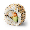 Ungurys, tempūroje keptos krevetės, sūris, avokadas, oranžiniai ikrai, teriaki padažas, sezamo sėklos.