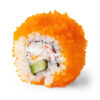 Skrudinta lašiša, tempūroje keptos krevetės, sūris, avokadas, agurkas, oranžiniai ikrai, teriaki padažas.