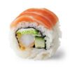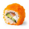 Ungurys, tempūroje keptos krevetės, sūris, avokadas, oranžiniai ikrai, teriaki padažas, sezamo sėklos.