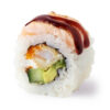Ungurys, tempūroje keptos krevetės, sūris, avokadas, oranžiniai ikrai, teriaki padažas, sezamo sėklos.
