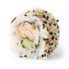 Tempūroje kepta krabų lazdelė, keptas ungurys, agurkas, sūris, juodi ir oranžiniai ikrai, teriaki padažas, sezamo sėklos.