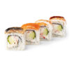 Surimi krabų mėsa, lašiša, keptas ungurys, ebi krevetės, sūris, agurkas.