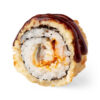 Ungurys, tempūroje keptos krevetės, sūris, avokadas, oranžiniai ikrai, teriaki padažas, sezamo sėklos.